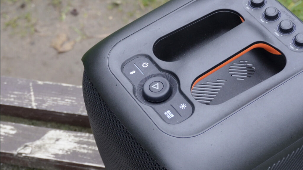 JBL hat den Partyboxen bereits vor einiger Zeit ein Update bei der Bedienung spendiert, Hauptelement ist nun ein großer Drehknopf, der die Lautstärke steuert. Drückt man diesen Knopf, steuert man die Wiedergabe.