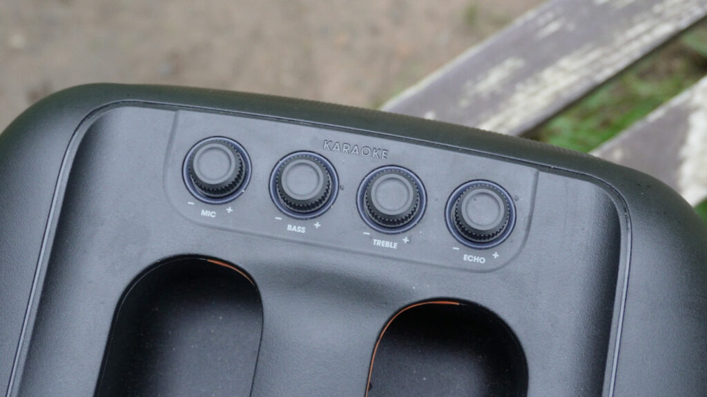 Für die Karaoke-Funktion stehen auch hier wieder die bekannten Drehregler zur Verfügung, für Mikrofon-Lautstärke, Höhen, Bässe und Hall.