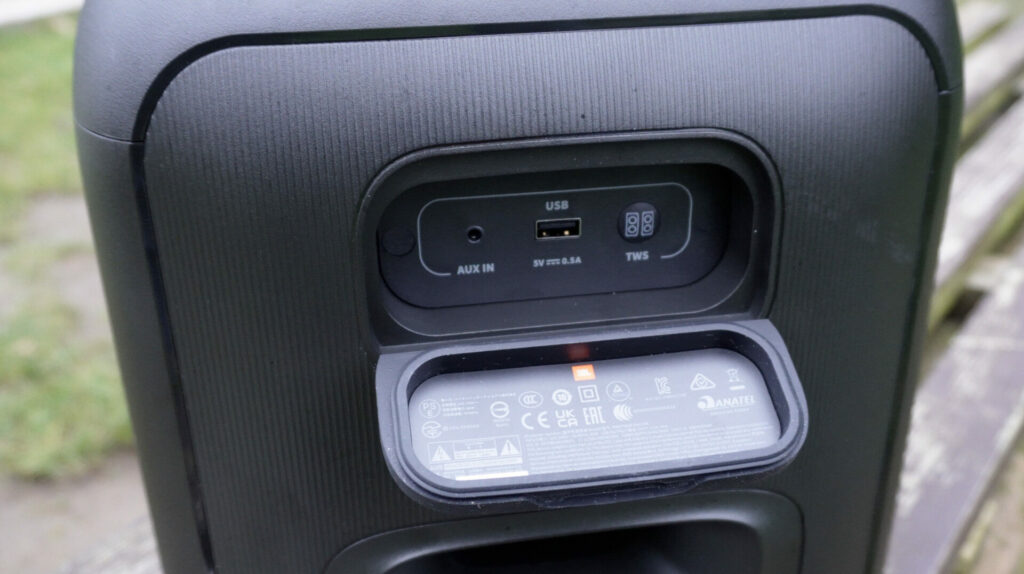Über den USB-A Anschluss könnt ihr auch euer Smartphone aufladen, allerdings nur mit 0,5A bei 5V, also 2,5 Watt – das ist sehr wenig. Andere Partyboxen von JBL haben hier normalerweise 2,1A, also 10 Watt.