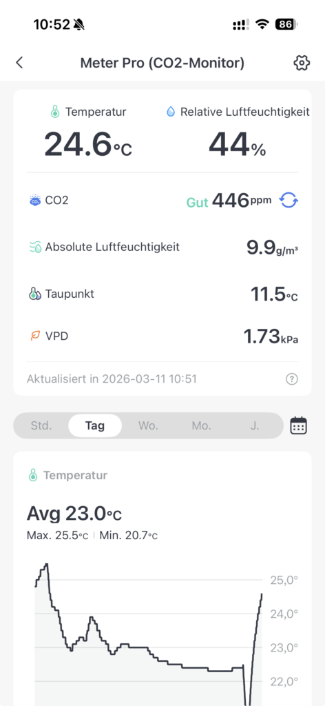 Besonders hilfreich ist dabei der CO2-Wert. Werte unter 1.000 ppm gelten als unbedenklich, zwischen 1.000 und 2.000 ppm sinkt die Konzentrationsfähigkeit spürbar, darüber wird es kritisch. Der Meter Pro misst im Bereich von 400 bis 9.999 ppm – mit einer Genauigkeit von ±5 %, die durch einen NDIR-Sensor (Non-Dispersive Infrared) sichergestellt wird. Die Temperatursensoren stammen von einem Schweizer Hersteller und gelten in der Branche als besonders zuverlässig. Kurz gesagt: Die Messtechnik steckt auf einem Niveau, das man in dieser Preisklasse nicht selbstverständlich erwarten darf.